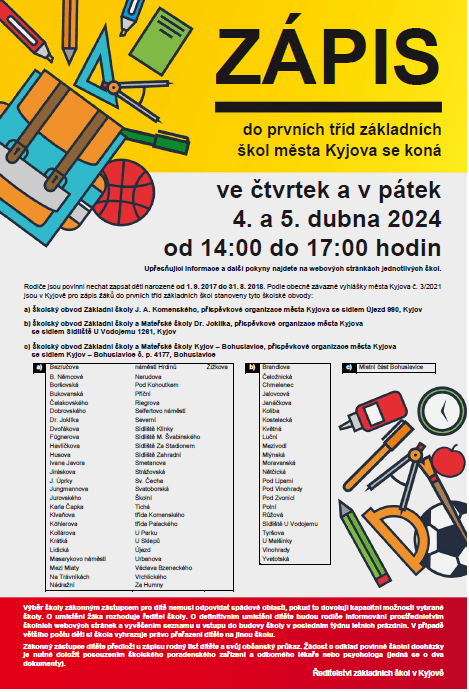 Ředitel ZŠ a MŠ Dr.Joklíka, příspěvkové organizace města Kyjova stanovil termín zápisu v souladu s právními předpisy na dny 4. a 5. dubna 2024, vždy v době od 14.00 do 17.00 hodin.